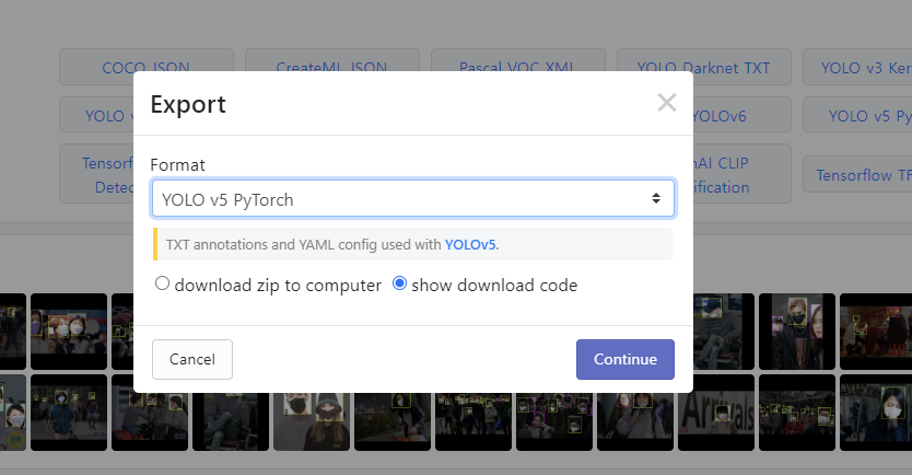 이도 동일하게 format을 YOLO v5 Pytorch로 설정해 다운로드합니다.