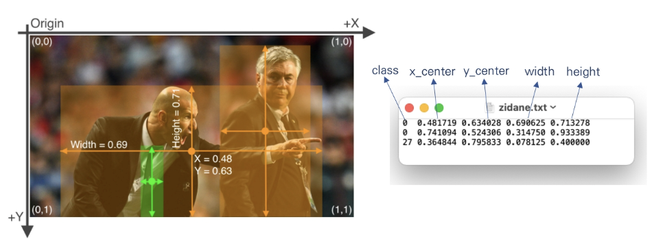 YOLOv5 공식 계정의 코드는 txt 포맷의 라벨링 데이터를 사용합니다. 이미지에서 검출된 object에 대한 클래스와 bounding box 정보가 저장되어 있습니다. 검출 객체 정보 배치는 [class, x_center, y_center, width, height] 형태로 되어있고 값은 이미지 사이즈로 정규화되어 있습니다.